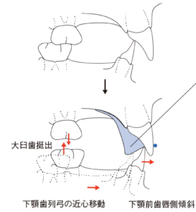 これに加えて、下顎が前方に成長するように促します。噛み合わせが装置使用前よりも前方になります。