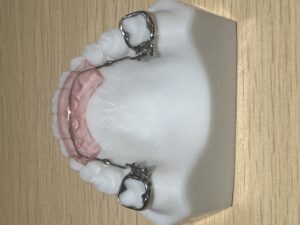 上の前歯の裏側にプラスチック(レジン)の板を装着します。奥歯には固定するためのバンドを装着します。下の前歯がこの板に当たります。そうすると奥歯が噛めなくなります。人の歯は、噛めないと噛む相手方の歯を探して挺出(伸びる)します。ちゃんと支える骨も増えますから安心してください。